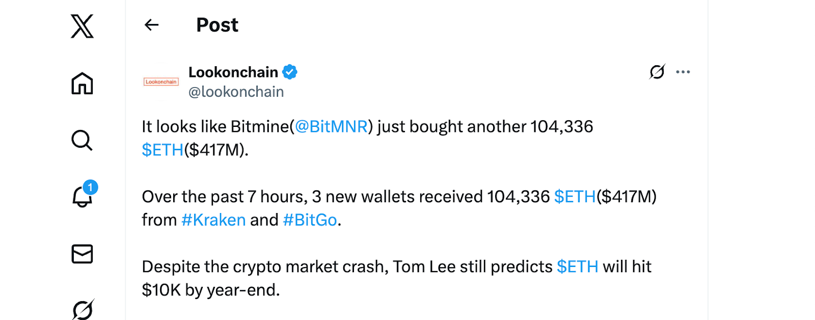 Ethereum saw heavy buying activity after prices fell nearly 20% from their highs. Onchain data shows BitMine purchased over 100,000 ETH, worth around $417 million, taking its total holdings to 3 million ETH—about 2.5% of Ethereum’s supply.