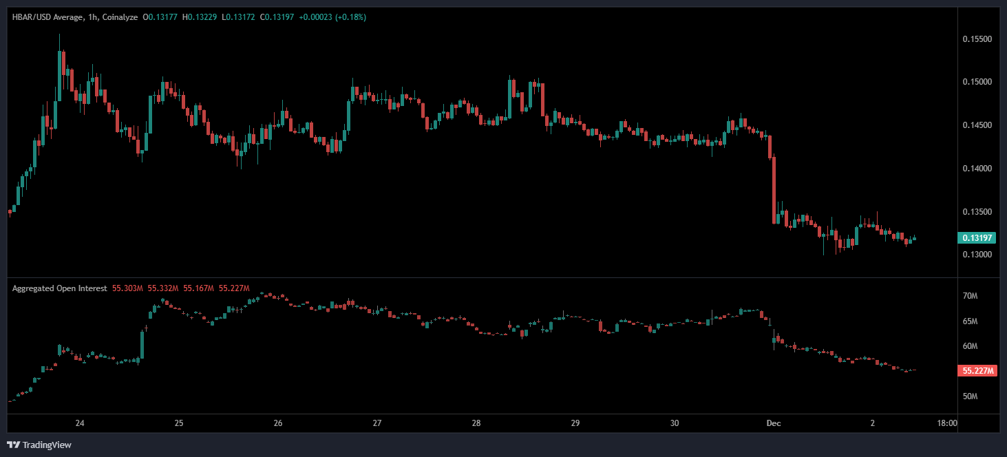 HBAR Price 2025: Holds Near $0.13 as Open Interest Declines and Momentum Cools